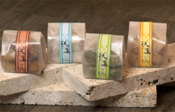 定番の県産紅芋、マロン、ゴマに季節によって変わるカボチャ、ヨモギなど織りパイと、もちの食感が大人気のヒ・ミ・ツ!